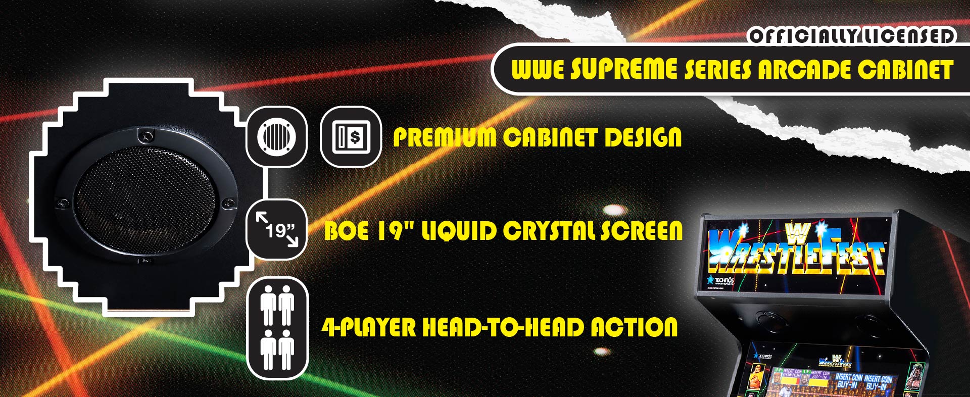 Step into the ring with the Arcade Classics WWE Supreme Series Arcade Game, a premium collector’s cabinet that brings five legendary arcade titles together in one unit. Relive the excitement of WrestleFest, SuperStars, The Big Pro Wrestling!, Super Dodgeball, and Acrobatic Dog-Fight—all faithfully recreated with authentic visuals, sounds, and gameplay for maximum nostalgia.Authentic Gameplay and Design